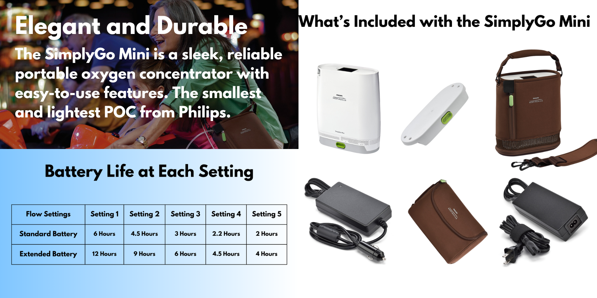 As the smallest and lightest POC ever developed by Philips Respironics, SimplyGo Mini is built to suit your needs with features like: attractive and sleek design; easy-to-remove external battery; light weight component, intuitive, easy-to-read screen; and a strong, comfortable carrying case.