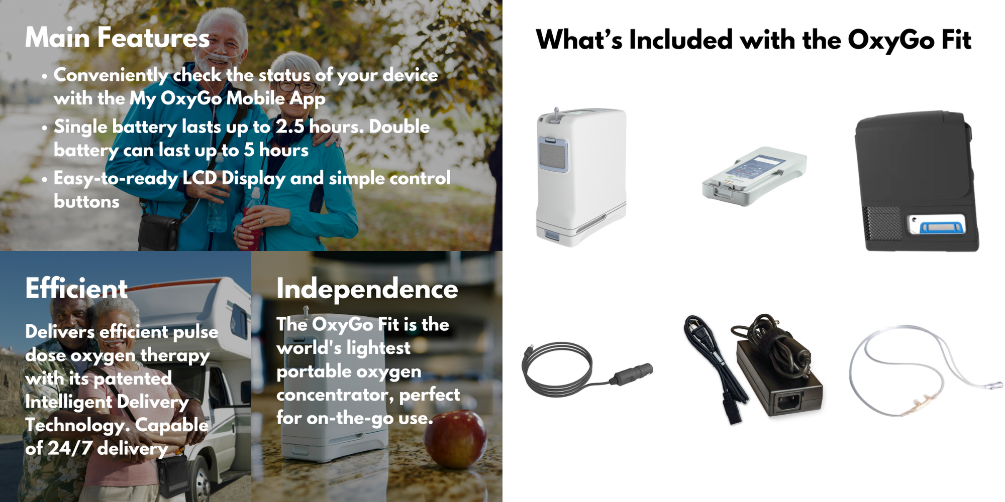 OxyGo FIT Portable Concentrator Kit Includes: 4/8 Cell Battery, Carry Bag, AC Power Supply and DC Power Supply, 3 year warranty, Sieve beds and battery 1 year warranty, Flow Settings 1-3