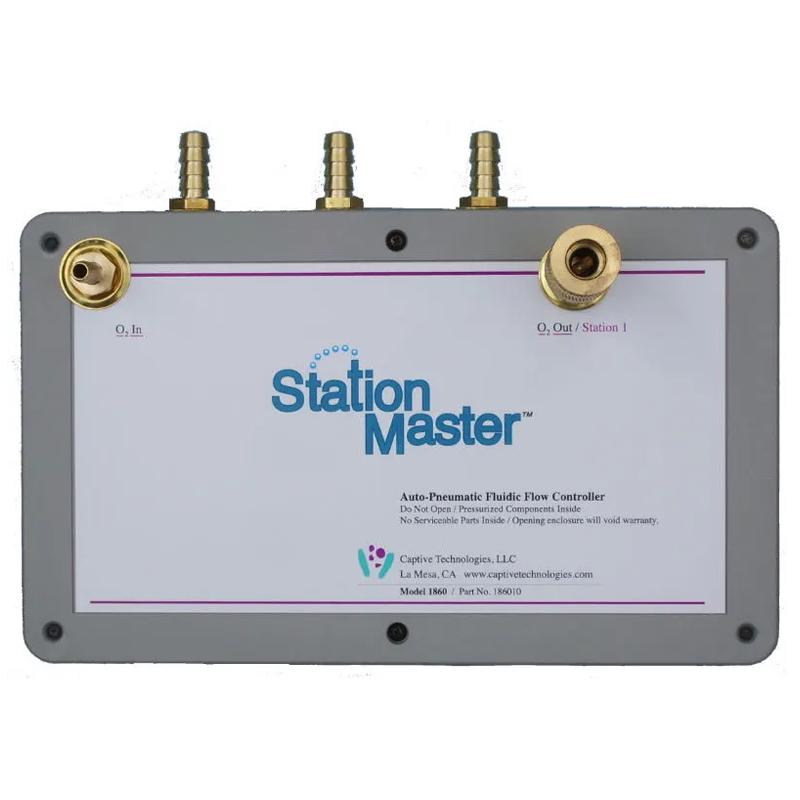 The Stationmaster is an in-home oxygen distribution system that lets you move from room to room without having to 'wrangle' a 50-foot tangle of oxygen tubing. The easy-to-install kit has a central fluidic Flow Controller that is fed by the existing oxygen system, such as a concentrator, and 3 additional remote oxygen outlets. With pressure-sensitive, adhesive-backed mounting strips on the back of the Flow Controller and Remote Stations, the system can be mounted to any convenient vertical surfaces. The Controller remains within four (4) feet of the oxygen system (concentrator, liquid reservoir, etc.), and the Remote Stations can be mounted up to 100 feet away. A household scissors is the only tool necessary to install.
