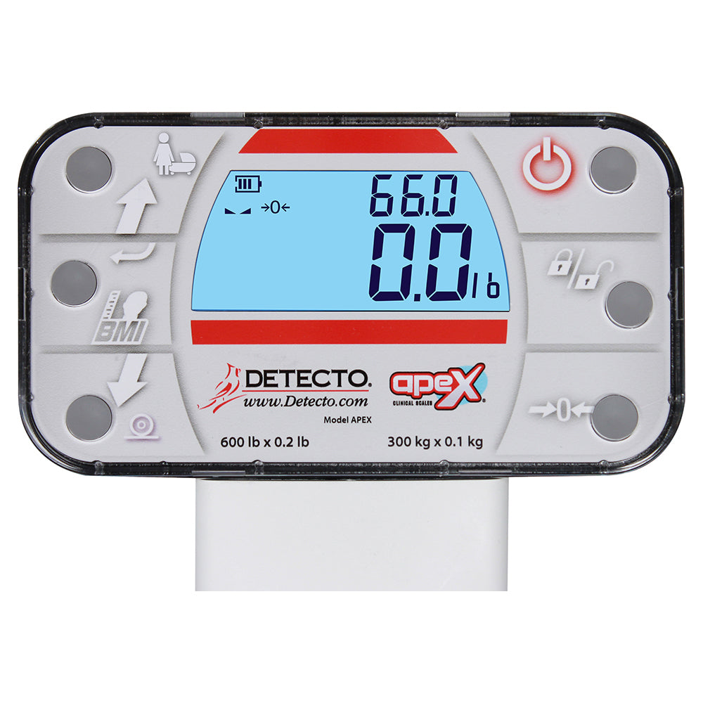 DETECTO's apex eye-level digital physician scales feature inline mechanical height rods and an extra-wide. The apex scale features 600 lb x 0.2 lb / 300 kg x 0.1 kg capacity, AC or battery power (AC adapter included on some models), sturdy column construction and integral bubble level.