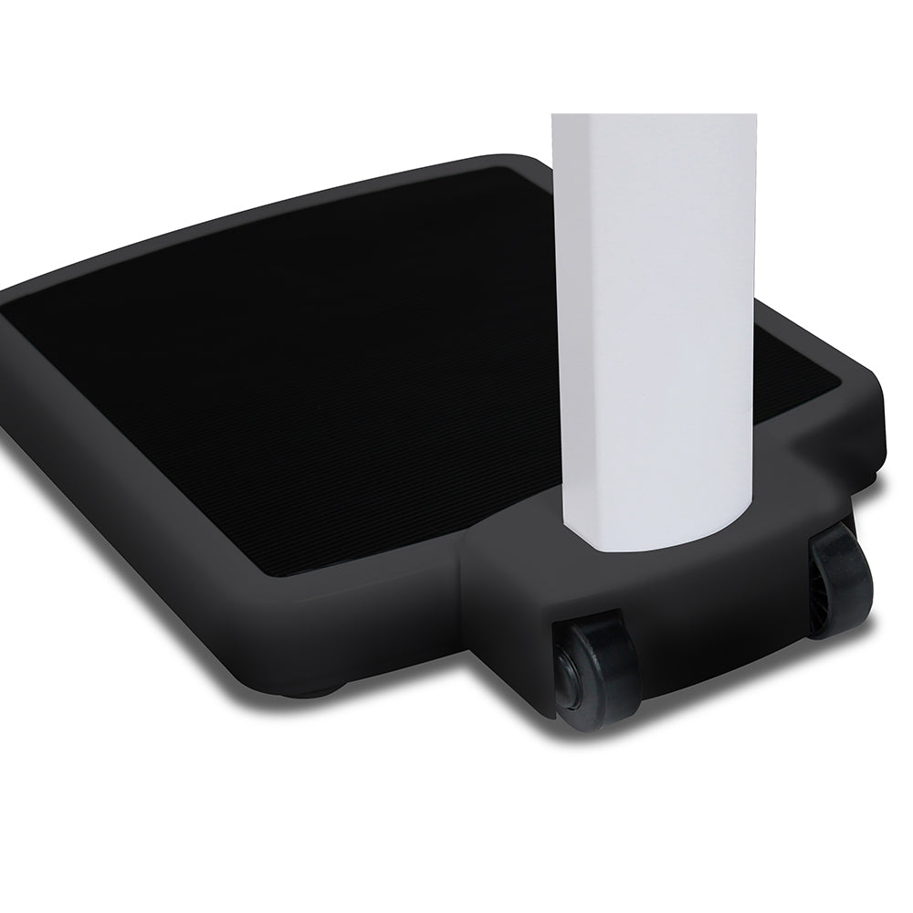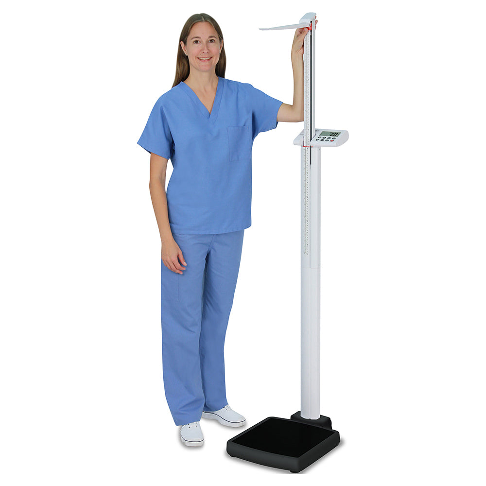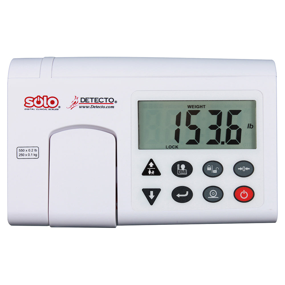 DETECTO's solo eye-level clinical scale is the most economical, high-quality digital physician scale with height rod available. The solo scale features 550 lb x 0.2 lb / 250 kg x 0.1 kg capacity, low-profile platform, inline mechanical height rod eye-level weight display and column, one-inch-high LCD readouts, Body Mass Index calculation, integral wheels for mobility, USB port, and convenient audible beep confirmation. The solo indicator features 8 simple buttons that are easily identifiable in any language. The solo is powered by 6 AA batteries which are included, or an optional AC adapter. One weigh units locking into Pounds or Kilograms avoids dosage errors based on incorrect units. The Mother/Baby mode factors the weight of infants and toddlers held by an adult.